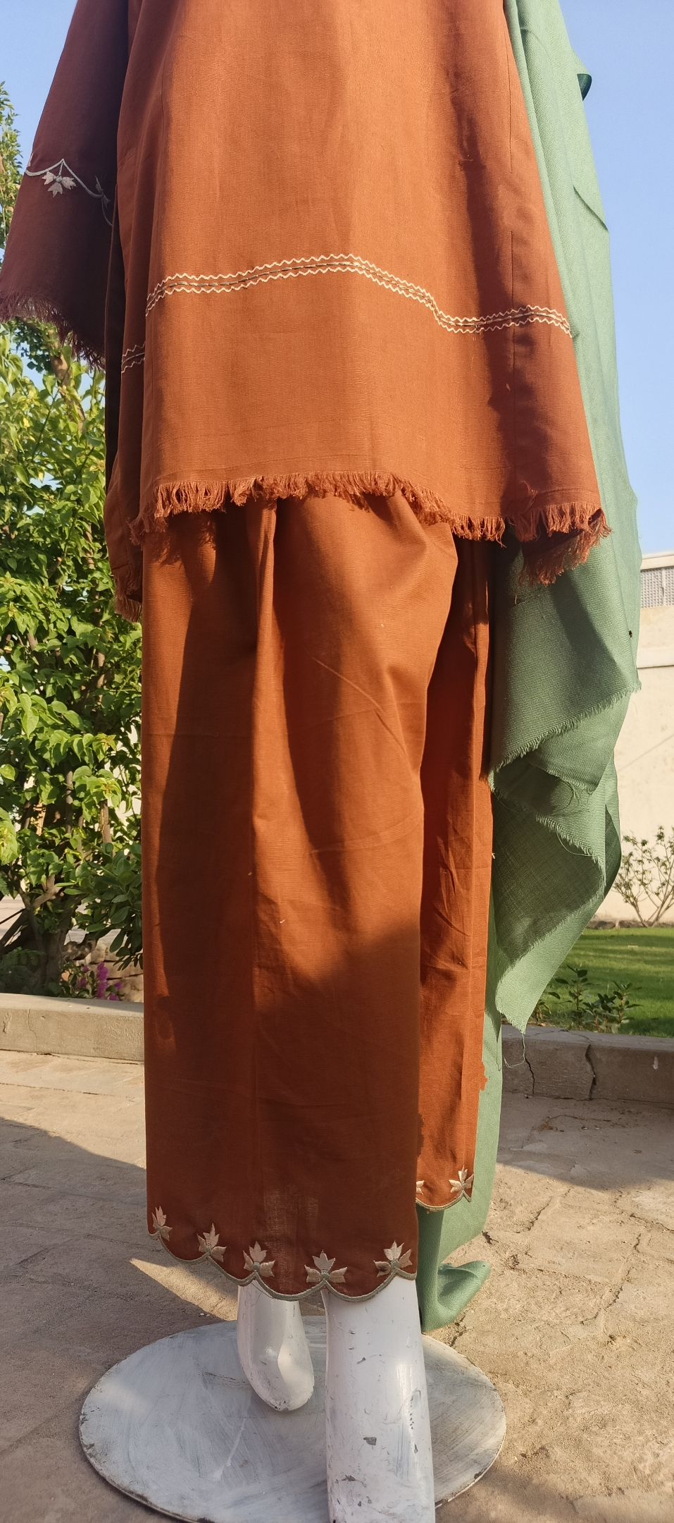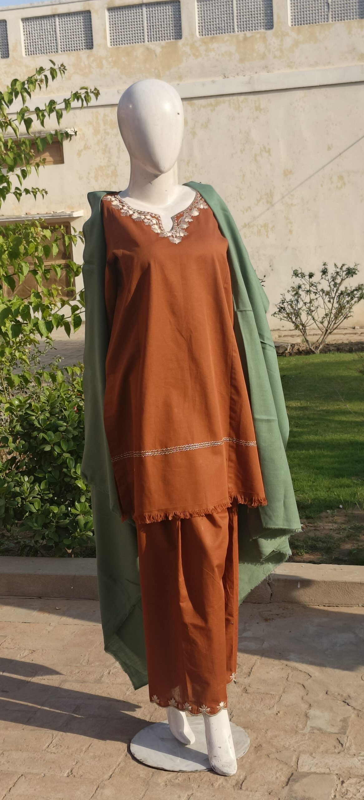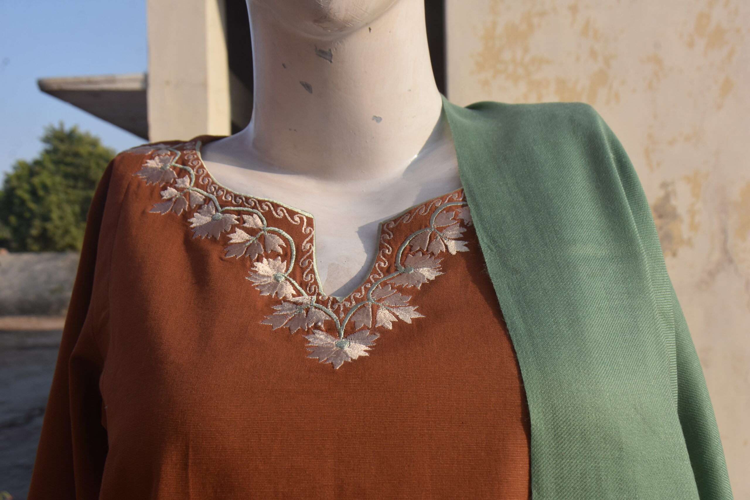 Shirt: Short, old-style khadar kurta with intricate embroidery in light brown thread