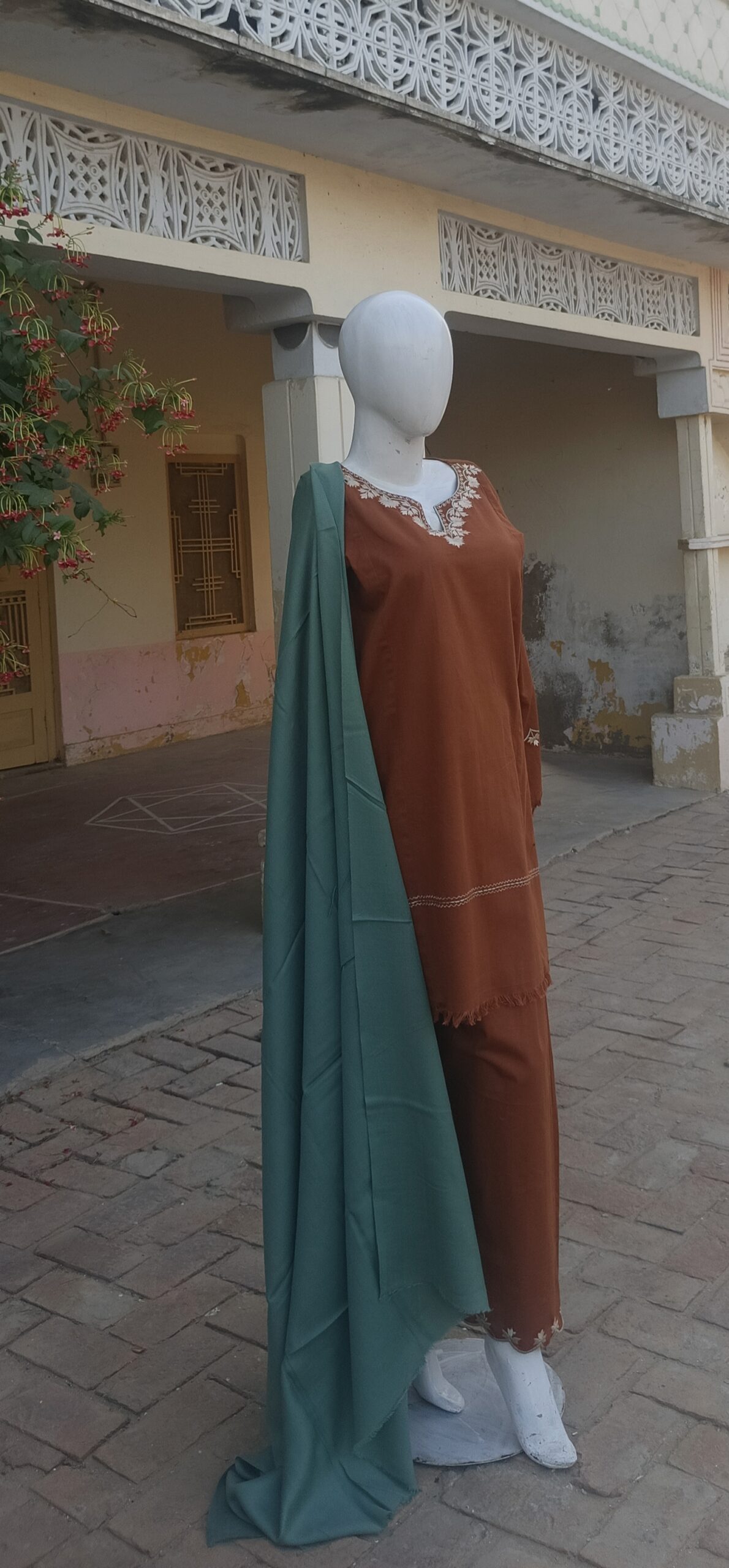 This premium outfit features a khadar kurta, Farshi shalwar, and a woolen shawl — tailored to perfection for the fall and winter season. Made from premium khadar with extensive embroidery in contrasting colours, it blends tradition with modern elegance.